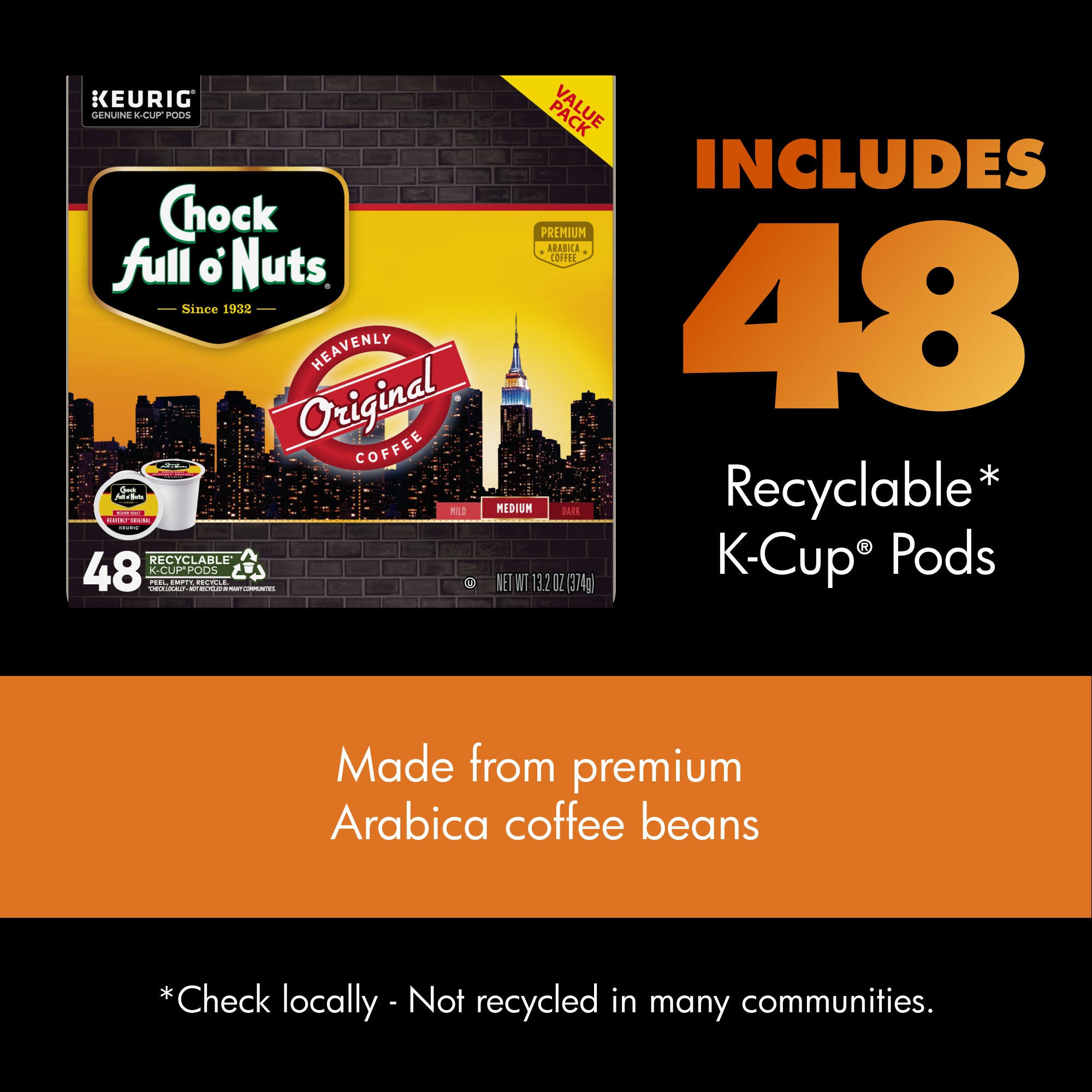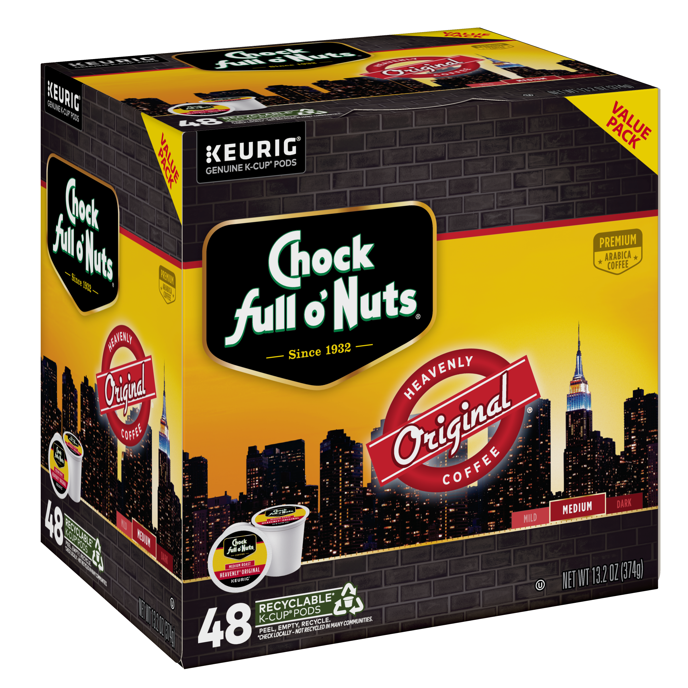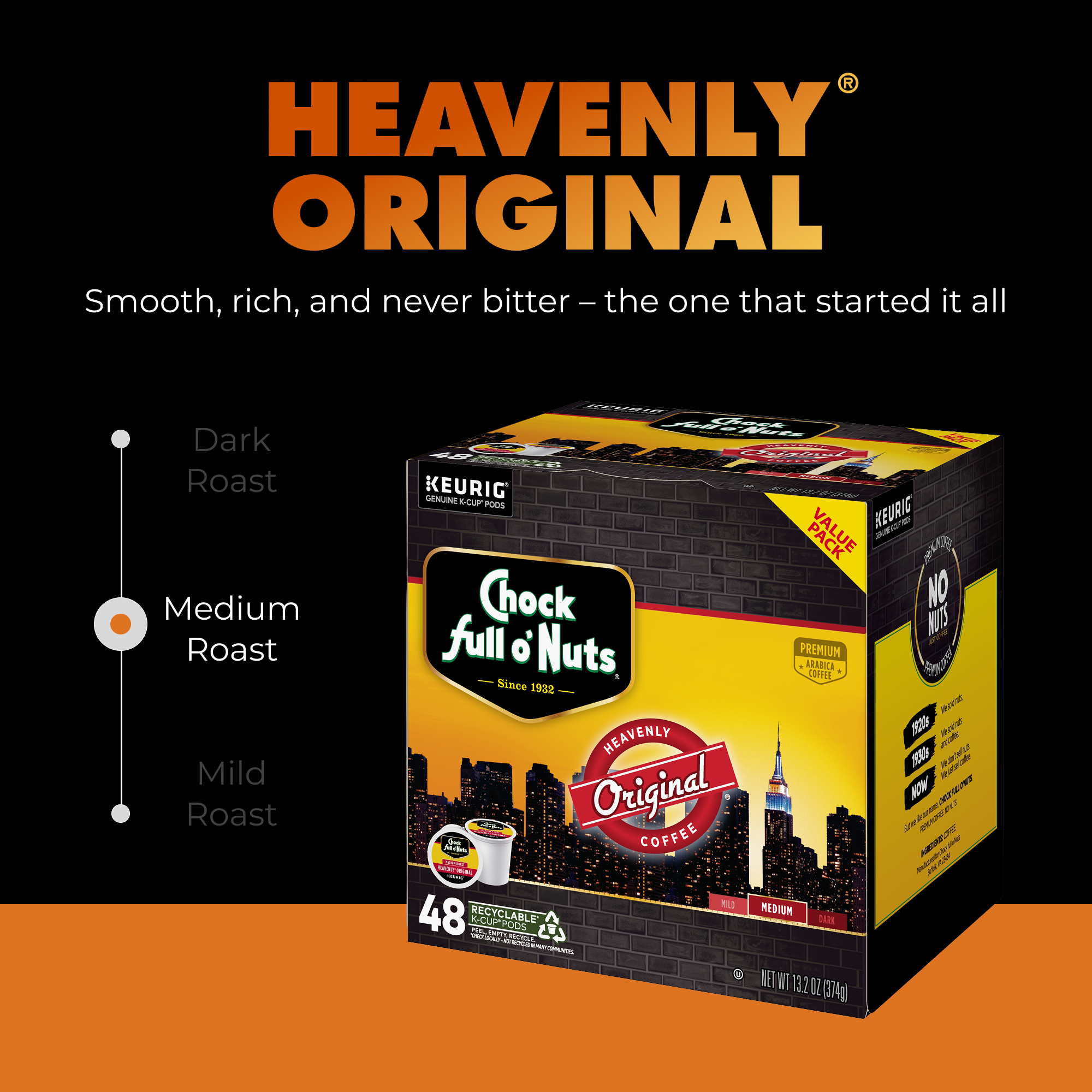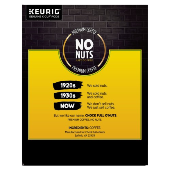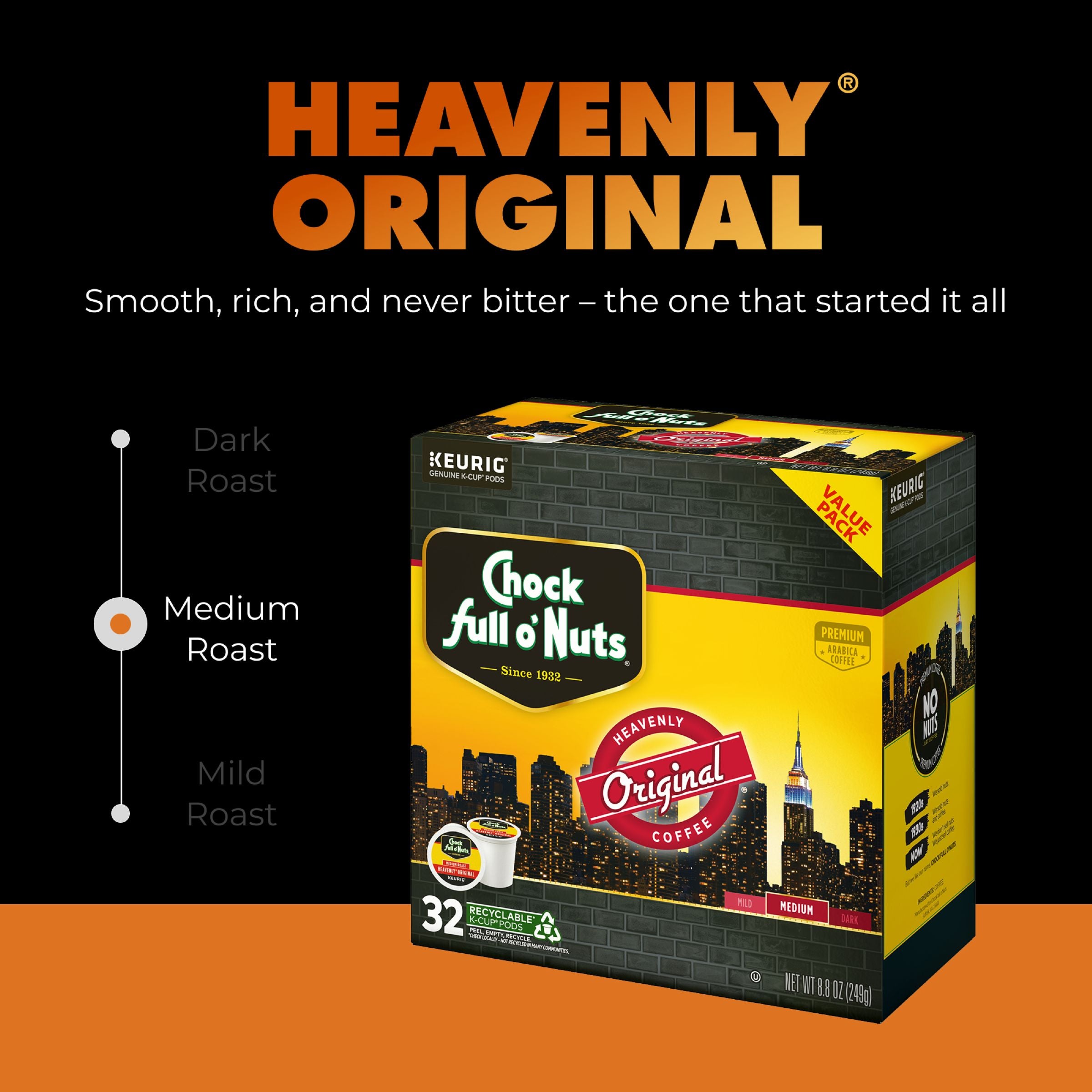 Since 1932, coffee lovers have been starting their day with Chock full o’Nuts® . Chock full o’Nuts® Original Roast medium blend coffee is the one that started it all. A rich, full-bodied blend that is smooth, not bitter or acidic, our Original Roast is the perfectly drinkable everyday coffee. Heavenly Original Medium Roast is made from premium coffee beans that are hand-selected from the finest growing regions. Starting from our first coffee shop on Broadway in New York City, Chock full o’Nuts® has been roasting perfectly flavored, aromatic coffee for nearly 100 years. Now you can enjoy an amazing cup of coffee day or night with our easy-to-use, K-Cup® pods. Chock full o'Nuts® K-Cup® pods work with any Keurig® brewer for an easy, consistent cup every time.